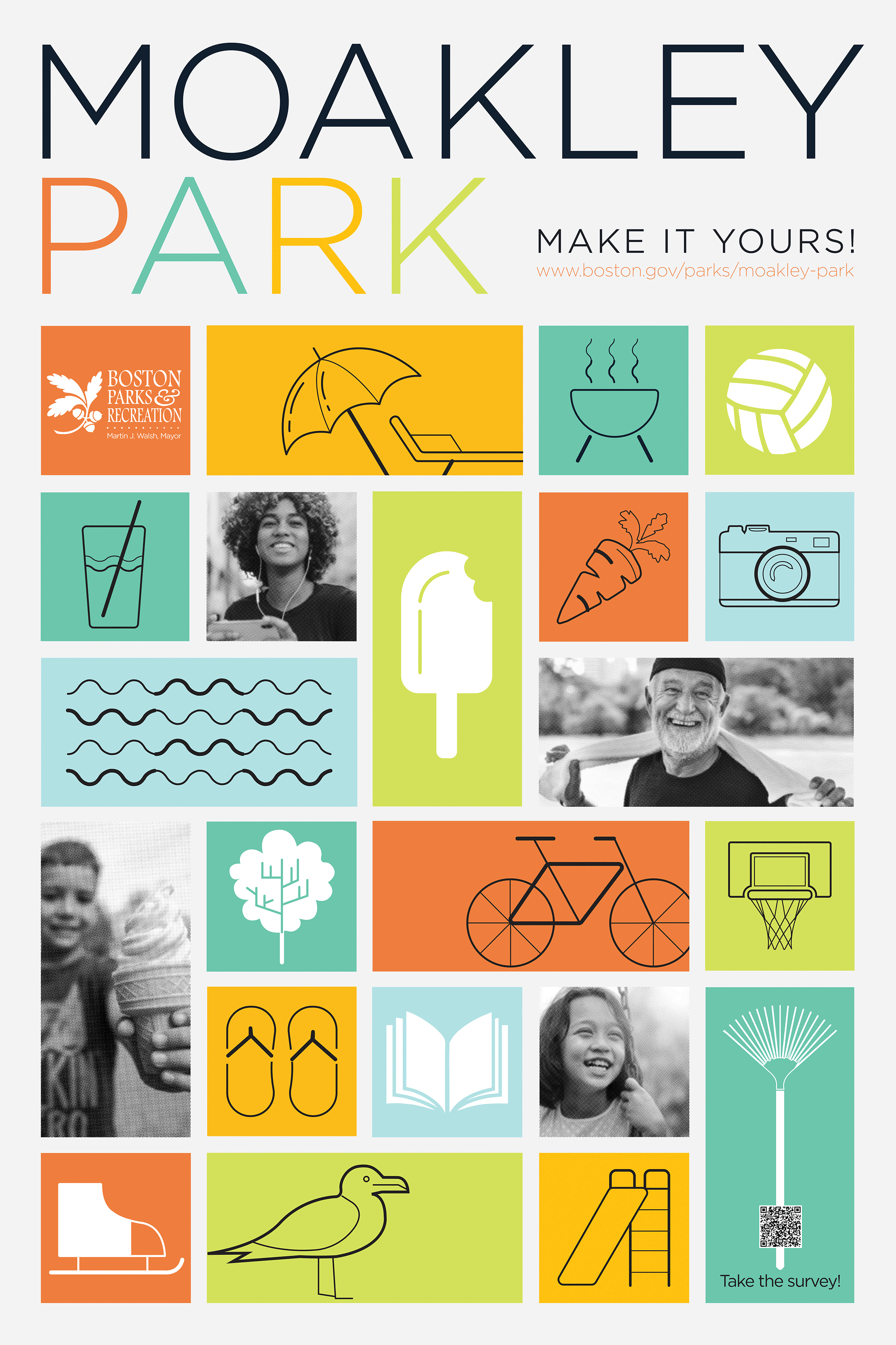An identity was created to brand the park redesign and energize ongoing public engagement campaigns. Vibrant, colorful iconography highlights the diversity of program and flexibility inherent in the redesign while black and white halftones show the diversity of people. This project executed with Stoss Landscape Urbanism.